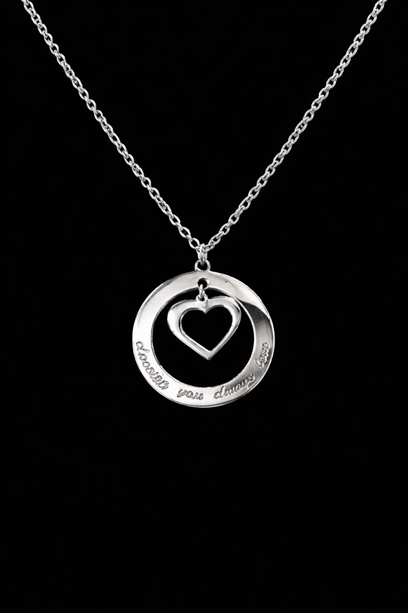 Ασημένιο μενταγιόν με χαραγμένο μήνυμα στην περιφέρειά του και καρδιά στο κέντρο. Προσωποποιείται με τη φράση της επιλογής σας και γίνεται ένα μοναδικό, συμβολικό δώρο αγάπης.