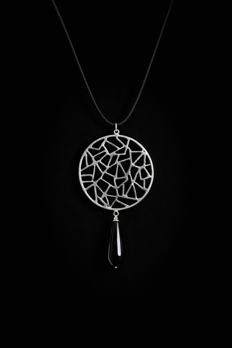 Χειροποίητο μενταγιόν από ασήμι και πέτρα από μαύρο όνυχα . Το μενταγιόν αυτό είναι ένα μοναδικό κόσμημα , που συνδυάζει τη λεπτομέρεια και τον minimal σχεδιασμό .