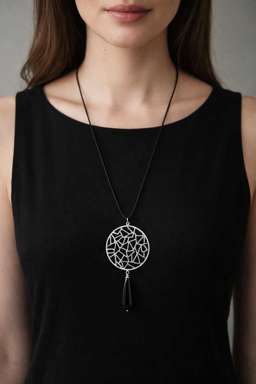 Στον κέντρο του κύκλου, κρέμεται μια μαύρη πέτρα ονυχα σε σχήμα δακρύου. Η πέτρα προσθέτει μια διακριτική πολυτέλεια και αναδεικνύει το μενταγιόν με την λάμψη της.