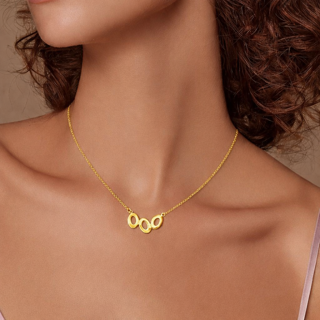 Το “Tria” είναι ένα minimal χειροποίητο μενταγιόν από ασήμι 925 με επιχρύσωση 24Κ, σχεδιασμένο με τρεις συνδεδεμένες οβάλ μορφές που δημιουργούν μια διακριτική, οργανική ροή.