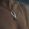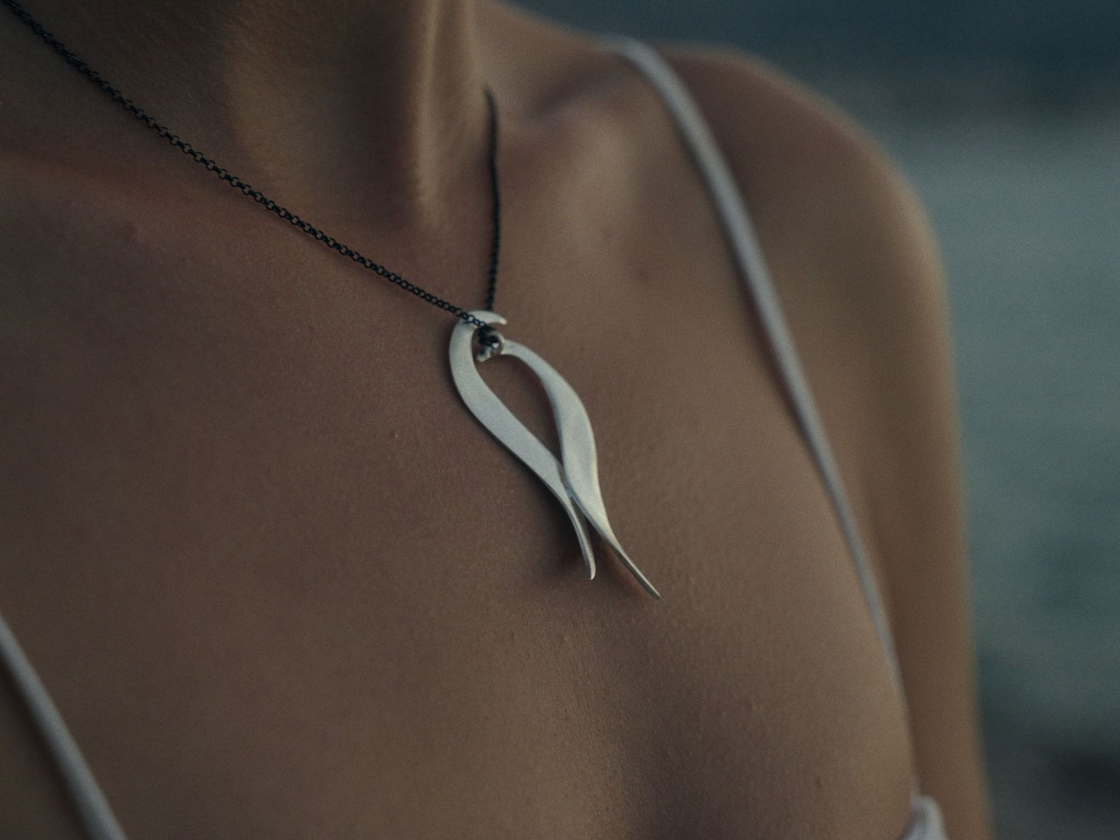 Χειροποίητο ασημένιο μενταγιόν που αποτελείται από δύο κυματιστά κομμάτια, ενωμένα μεταξύ τους, δημιουργώντας μια αρμονική και πρωτότυπη σύνθεση που γοητεύει με την κίνησή της και την φυσική ροή του σχεδιασμού. Οι καμπύλες γραμμές προσδίδουν έναν αέρα ελευθερίας και ισορροπίας, κάνοντάς το ένα κομμάτι που ακτινοβολεί διαχρονικότητα και κομψότητα.