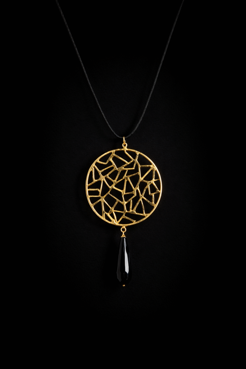 Στο κέντρο του , κρέμεται μια μαύρη πέτρα από όνυχα σε σχήμα δάκρυ, η οποία προσθέτει μία έντονη αντίθεση με το και επιχρυσωμένο σχέδιο, χαρίζοντας μυστήριο και φινέτσα. Ο μαύρος όνυχας αναδεικνύει τη γοητεία και τη δύναμη του κοσμήματος, καθιστώντας το ιδανικό για να φορεθεί τόσο κατά τη διάρκεια της ημέρας όσο και σε πιο ιδιαίτερες εμφανίσεις, προσθέτοντας ένα στοιχείο διακριτικής πολυτέλειας και στυλ.