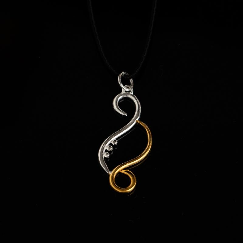 Ένα χειροποίητο μενταγιόν–γούρι από ορείχαλκο με διπλή επιμετάλλωση, όπου το ασήμι και το χρυσό ενώνονται σε μια συνεχόμενη, ρέουσα γραμμή.