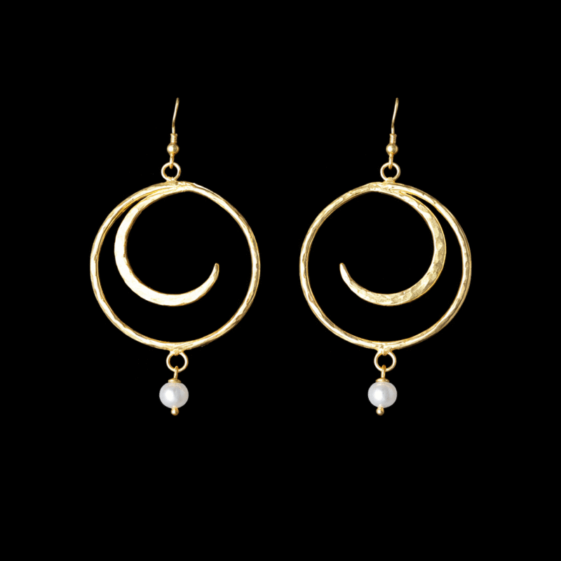 Χειροποίητα σκουλαρίκια σε σχήμα κύκλου, μέσα στον οποίο εκτυλίσσεται μια αρμονική καμπύλη, προσθέτοντας μια καλλιτεχνική αίσθηση στο σχέδιο. Η επιφάνειά τους είναι σφυρήλατη, προσφέροντας μια διακριτική, ανάγλυφη υφή που αναδεικνύει την χειροποίητη τέχνη. Στο τελείωμά τους κρέμεται ένα λαμπερό μαργαριτάρι, το οποίο προσθέτει μια πινελιά διαχρονικής πολυτέλειας και κομψότητας.