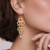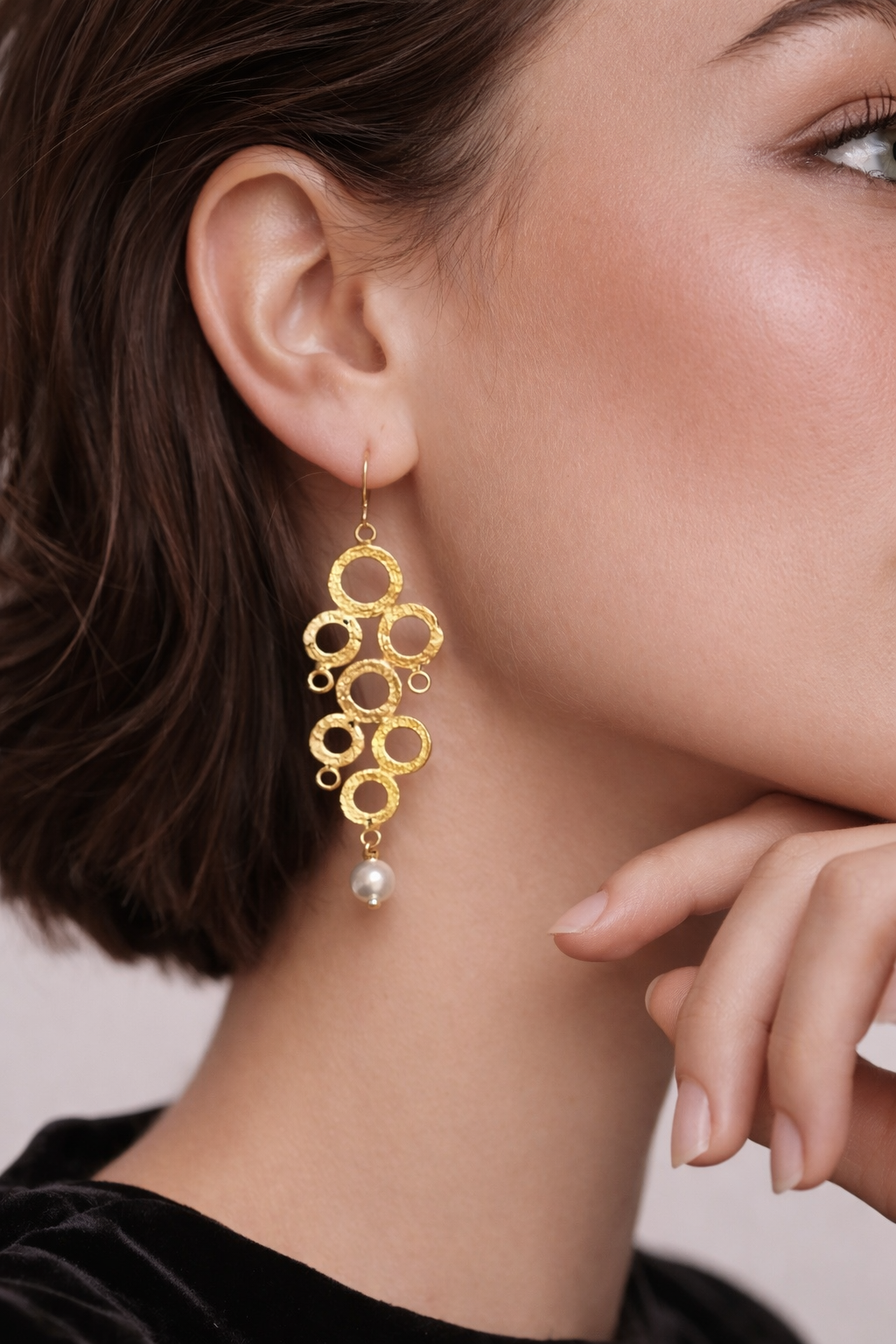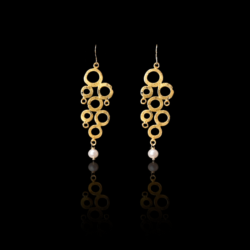 Χειροποίητα σκουλαρίκια από ασήμι με επιχρύσωση που αποτελούνται από μια μοναδική σύνθεση μικρών κυκλικών στοιχείων που ενώνονται αρμονικά, δημιουργώντας ένα εντυπωσιακό σύνολο. Η υφή της επιφάνειας είναι ματ, προσδίδοντας μια εκλεπτυσμένη και κομψή εμφάνιση. Στο κάτω μέρος κάθε σκουλαρικιού κρέμεται ένα λευκό μαργαριτάρι fresh perl . Τα σκουλαρίκια αυτά είναι ιδανικά για κομψές εμφανίσεις, προσφέροντας λάμψη και φινέτσα χωρίς να είναι υπερβολικά.