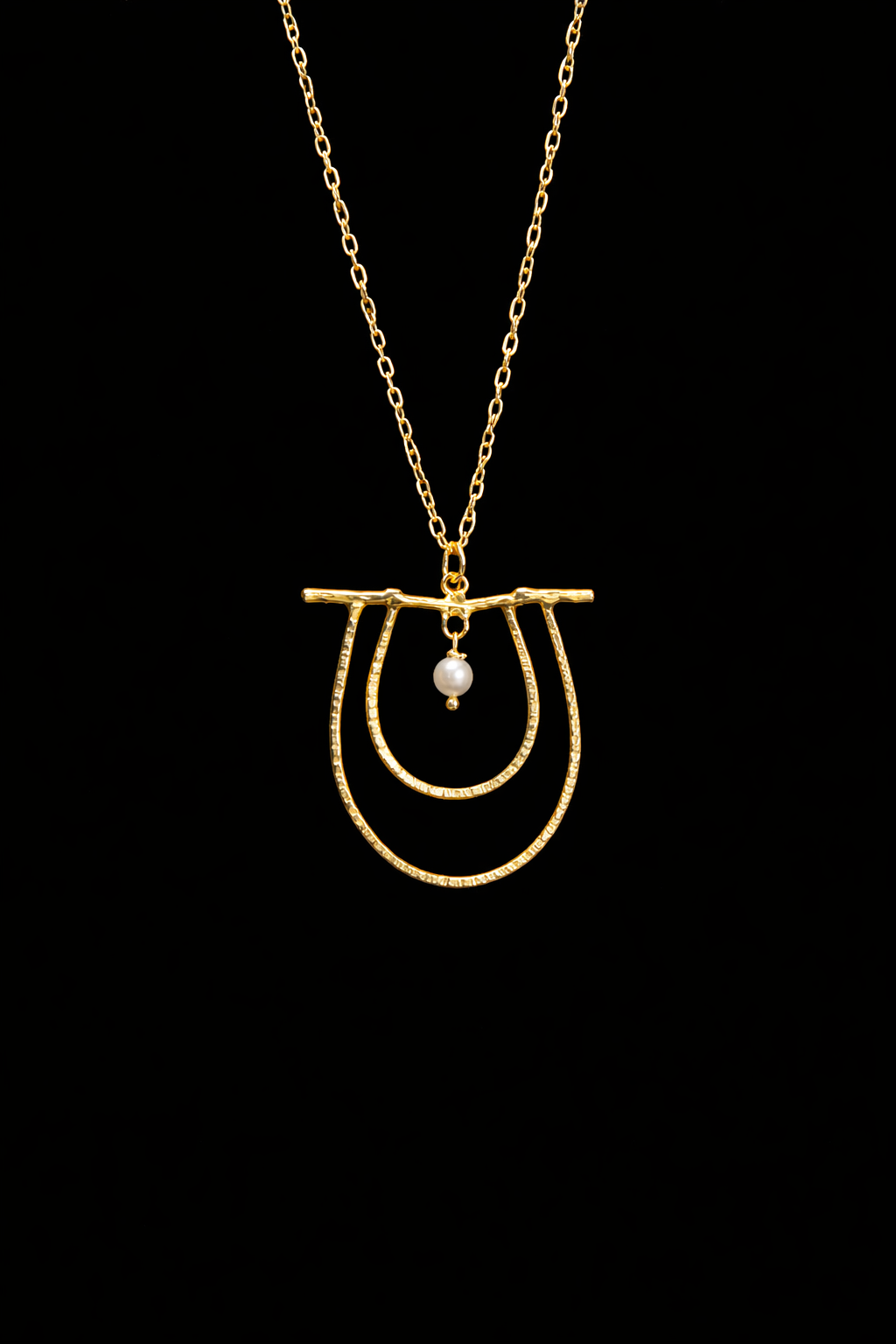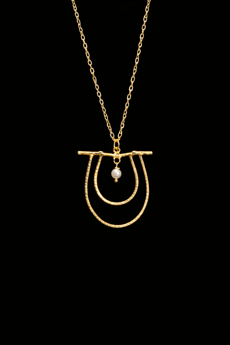 Χειροποίητο μενταγιόν από ασήμι και επιχρύσωση, φτιαγμένο από σφυρήλατο σύρμα που του προσδίδει έναν μοναδικό, καλλιτεχνικό χαρακτήρα.  Στο κέντρο του μενταγιόν δεσπόζει ένα λευκό μαργαριτάρι fresh perl, προσθέτοντας μία νότα πολυτέλειας και φυσικής φινέτσας στο σχέδιο.