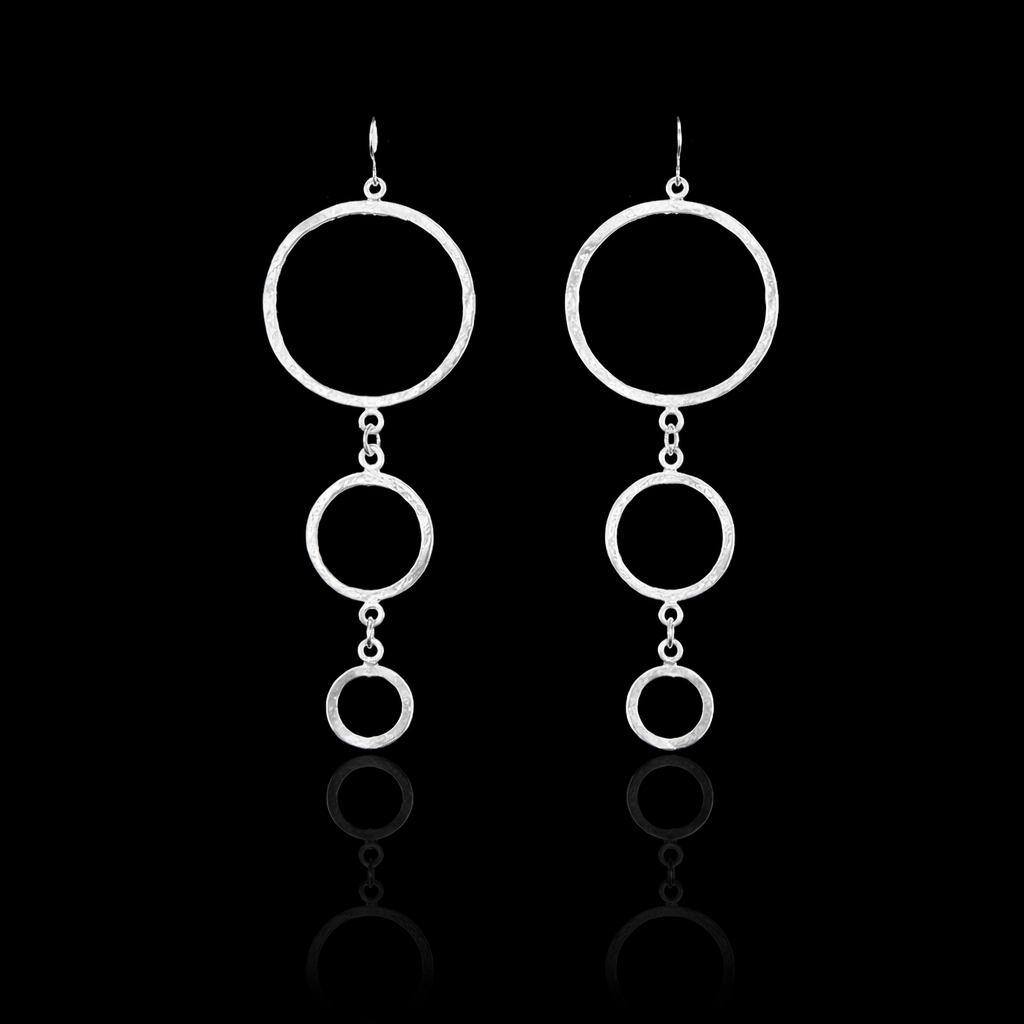 Χειροποίητα ασημένια σκουλαρίκια, που αποτελούνται  από τρεις  κύκλους που κρέμονται διαδοχικά, δημιουργώντας ένα αέρινο και μοντέρνο σχέδιο. Το μακρύ τους στυλ προσδίδει κομψότητα και κίνηση σε κάθε εμφάνιση, ενώ η ελαφριά τους κατασκευή τα καθιστά εξαιρετικά άνετα και ιδανικά για καθημερινή χρήση. Αυτά τα  σκουλαρίκια μπορούν να φορεθούν όλη την ημέρα, προσφέροντας στυλ και φινέτσα, είτε για καθημερινές εμφανίσεις είτε για πιο ιδιαίτερες περιστάσεις.