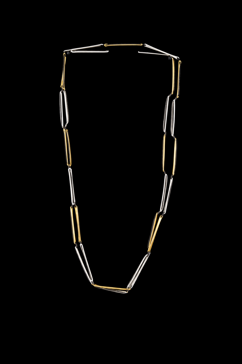 Χειροποίητο μακρύ κολιέ από ασήμι που ξεχωρίζει για τον μοναδικό και εντυπωσιακό του σχεδιασμό. Αποτελείται από πολλές λεπτές ασημένιες και  επιχρυσωμένες μπάρες , δημιουργώντας μια ενδιαφέρουσα αντίθεση ανάμεσα στο ασημένιο και το χρυσό. Οι μπάρες αυτές συνδέονται μεταξύ τους με μαύρο νήμα, προσδίδοντας μία μοντέρνα και κομψή αίσθηση στο κόσμημα.
