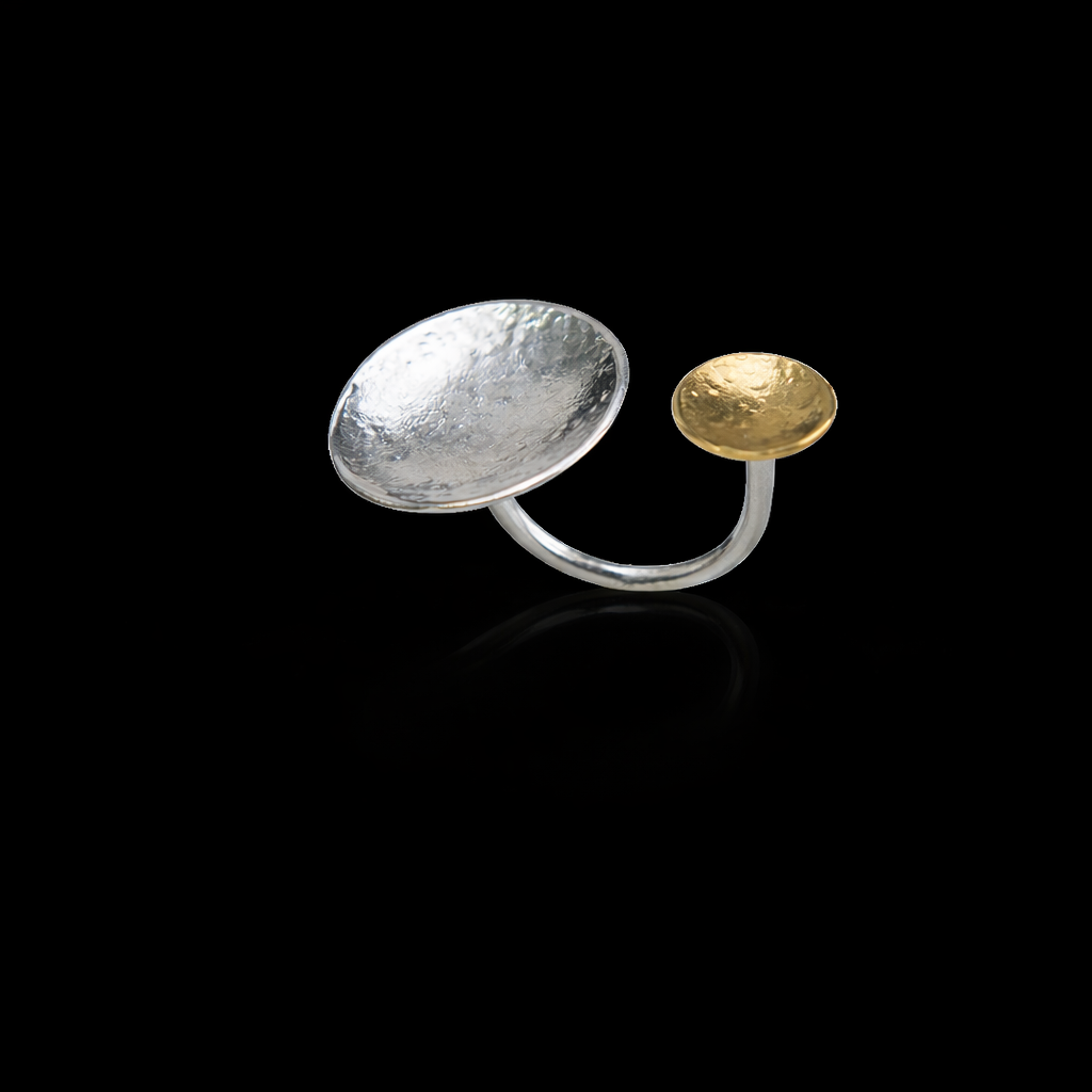 Χειροποίητο ασημένιο δαχτυλίδι που αποτελείται από δύο δίσκους, έναν μεγαλύτερο και έναν μικρότερο, δημιουργεί μια εντυπωσιακή και κομψή αισθητική.